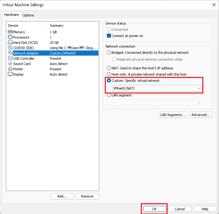 Custom에서 VMnet8(NAT)를 선택하시고, OK를 클릭합니다.