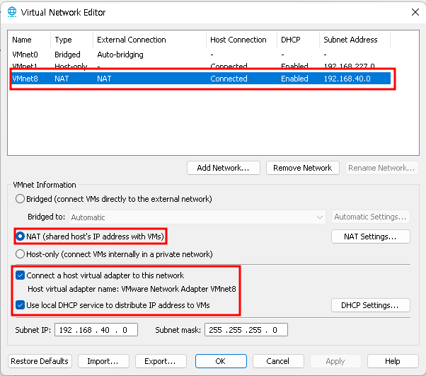 NAT로 설정이 되어있는지, Virtual Adapter와 연결되어 있는지, DHCP Service로 IP를 받아오는지